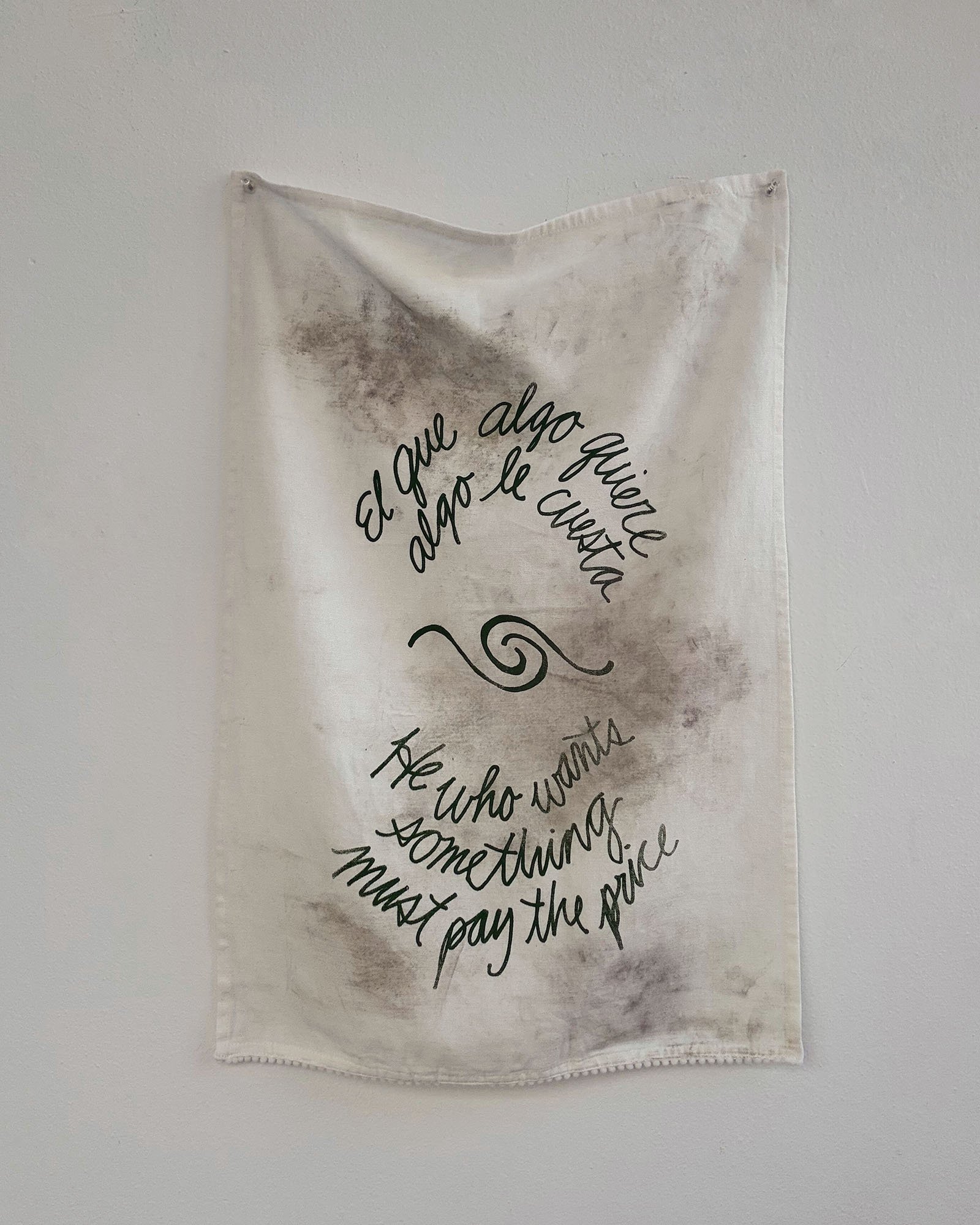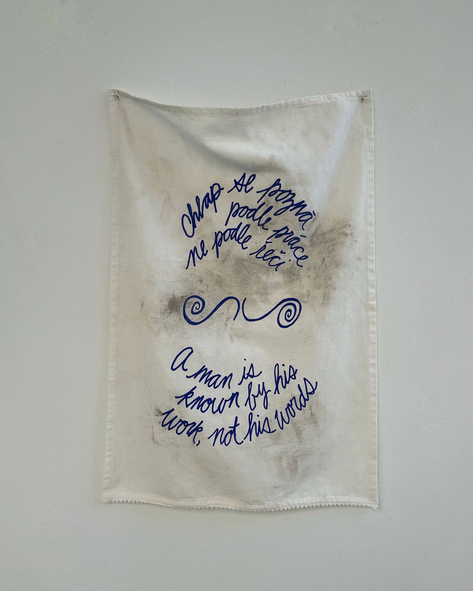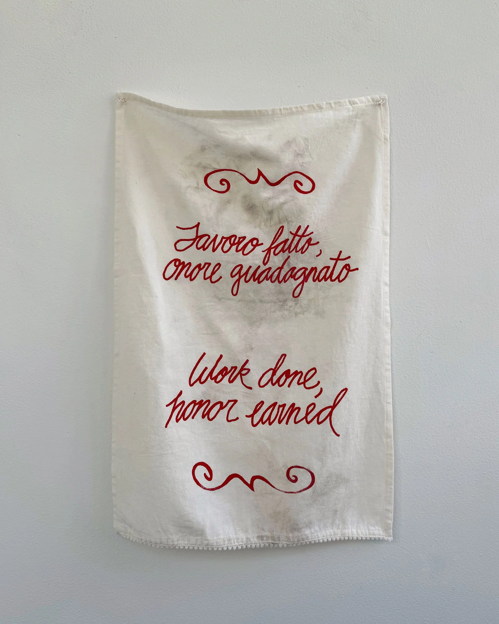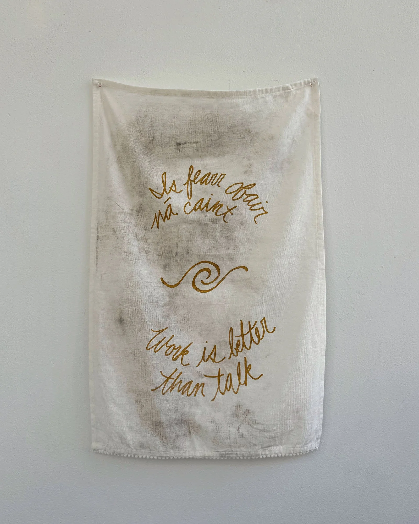 Across cultures, proverbs function to persuade, teach morals, and reinforce identity. They also reflect the values, social norms, and power dynamics of their time, often preserving assumptions that feel outdated. An Té a Choimeádann an Tine, Coimeádann Sé an Teach is a series of tea towels created for Fracture Point at the Granite Museum in Barre, Vermont. Printed with proverbs exalting the value of hard work, each represents one of the numerous immigrant groups that came to Barre to work in the granite industry starting in the late 19th century. Within a few years, many immigrant men brought wives, children, and relatives from their home countries. By the early 20th century, Barre had thriving ethnic neighborhoods with households, businesses, and places of worship. It was the arrival of women and children that transformed Barre from a transient labor camp into a permanent immigrant community. While the skill, commitment, and hard work of the granite workers are undeniable, they depended on a network of support. Women sustained households through invisible labor; they worked in local businesses and volunteered. Their contributions enabled men to work in the quarries or in the plant. These tea towels, dirtied with stone dust, are an ode to these women and their contributions to Barre’s rich granite history.