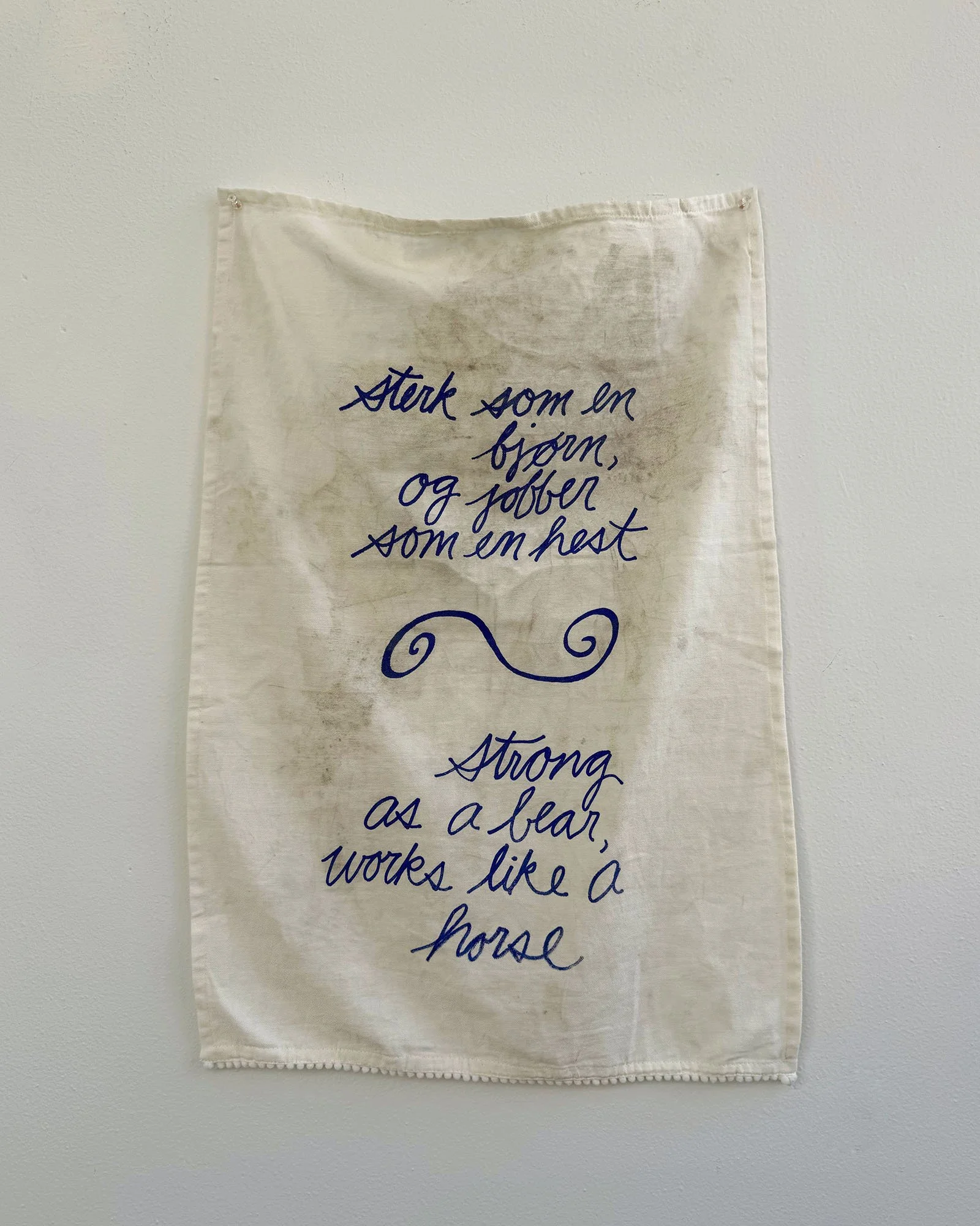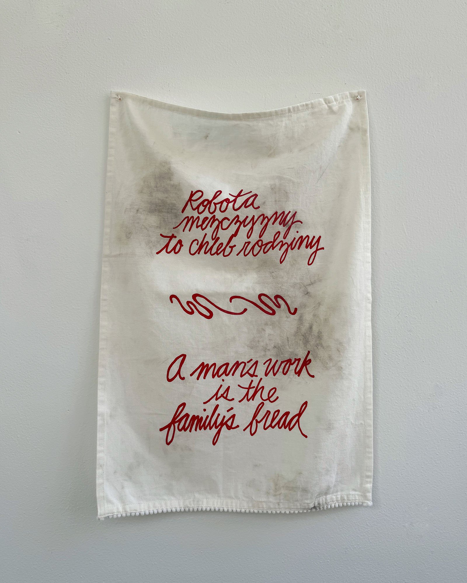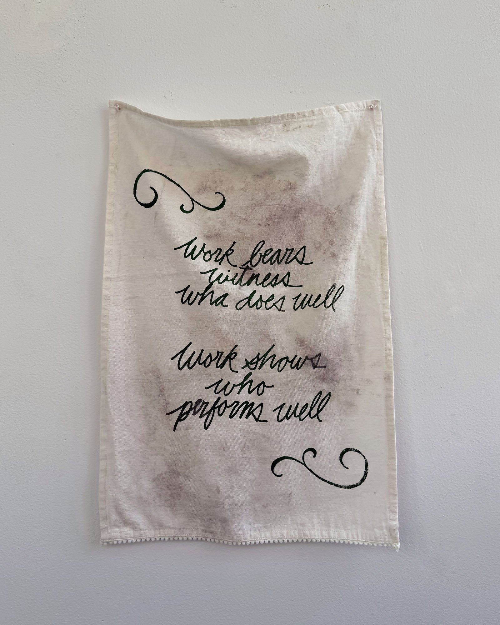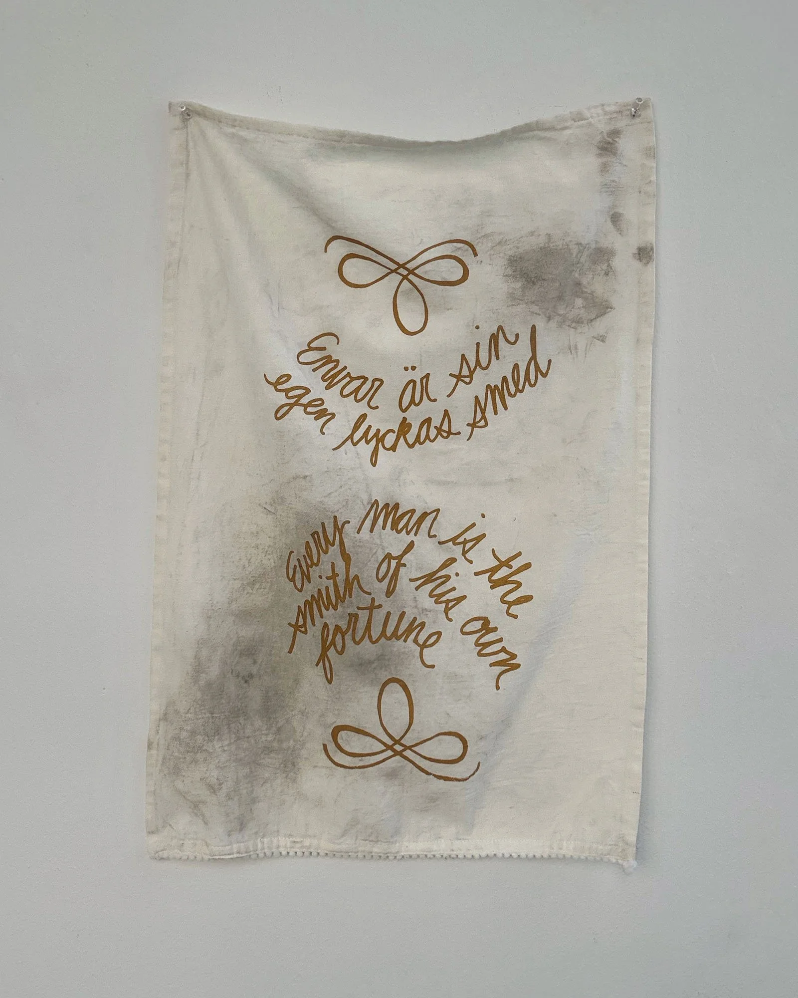 Across cultures, proverbs function to persuade, teach morals, and reinforce identity. They also reflect the values, social norms, and power dynamics of their time, often preserving assumptions that feel outdated. An Té a Choimeádann an Tine, Coimeádann Sé an Teach is a series of tea towels created for Fracture Point at the Granite Museum in Barre, Vermont. Printed with proverbs exalting the value of hard work, each represents one of the numerous immigrant groups that came to Barre to work in the granite industry starting in the late 19th century. Within a few years, many immigrant men brought wives, children, and relatives from their home countries. By the early 20th century, Barre had thriving ethnic neighborhoods with households, businesses, and places of worship. It was the arrival of women and children that transformed Barre from a transient labor camp into a permanent immigrant community. While the skill, commitment, and hard work of the granite workers are undeniable, they depended on a network of support. Women sustained households through invisible labor; they worked in local businesses and volunteered. Their contributions enabled men to work in the quarries or in the plant. These tea towels, dirtied with stone dust, are an ode to these women and their contributions to Barre’s rich granite history.