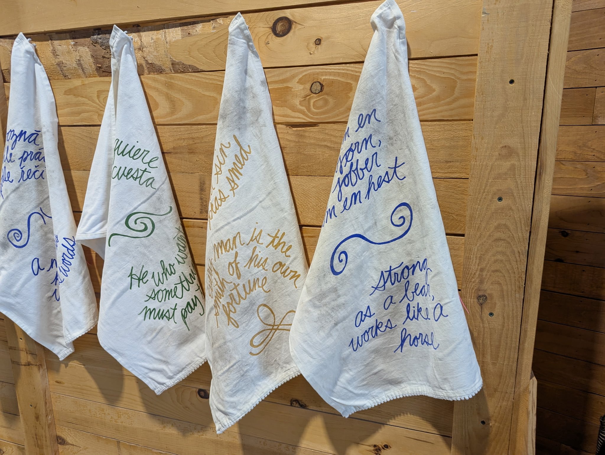 Across cultures, proverbs function to persuade, teach morals, and reinforce identity. They also reflect the values, social norms, and power dynamics of their time, often preserving assumptions that feel outdated. Who Keeps the Fire, Keeps the House is a series of tea towels printed with proverbs exalting the value of hard work. Each represents one of the numerous immigrant groups that came to Barre to work in the granite industry starting in the late 19th century. Within a few years, many immigrant men brought wives, children, and relatives from their home countries. By the early 20th century, Barre had thriving ethnic neighborhoods with households, businesses, and places of worship. It was the arrival of women and children that transformed Barre from a transient labor camp into a permanent immigrant community. While the skill, commitment, and hard work of these granite workers are undeniable, they depended on a network of support. Women sustained households through invisible labor; they worked in local businesses and volunteered. Their contributions enabled men to work in the quarries or in the plant. These tea towels, dirtied with stone dust, are an ode to these women and their contributions to Barre’s rich granite history.